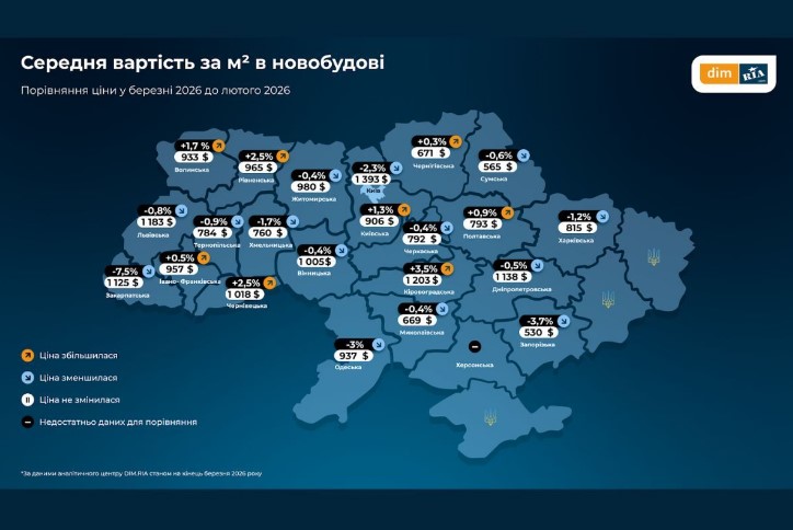 У Дніпропетровській області у березні 2026 року помітно зріс попит на купівлю житла в новобудовах. За даними маркетплейсу нерухомості DIM.RIA, кількість зацікавлених покупців у регіоні збільшилася на 25% порівняно з лютим. Середня вартість за метр квадратний у новобудові становить 1 138 доларів. Водночас на вторинному ринку житла фіксують незначне зростання цін.