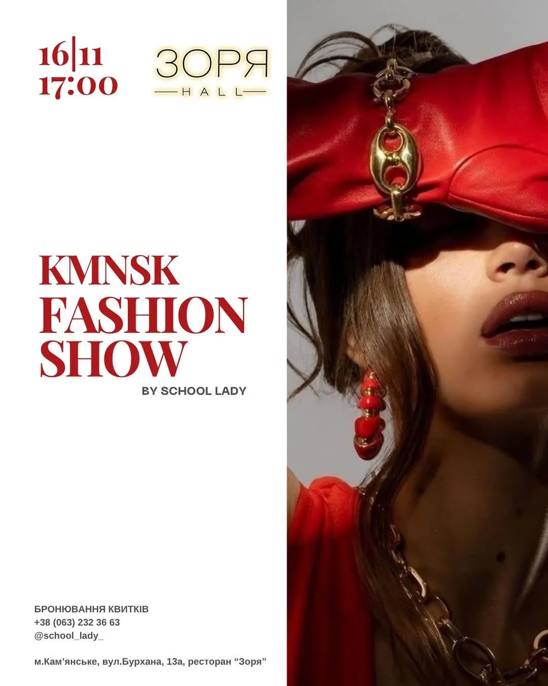 Мода оживає саме тут! KMNSK FASHION SHOW — подія, яка надихає, захоплює і дарує яскраві емоції! Маленькі зірки продемонструють великі мрії, стильні образи та справжню впевненість на подіумі. Це шоу, яке хочеться бачити та пережити. Подія відбудеться 16 листопада о 17:00 у ресторані “Зоря”, Кам’янське, вул. Бурхана, 13а. Бронювання: @school_lady_ , +38 (063) 232 36 63 Приєднуйся до світу моди і краси.