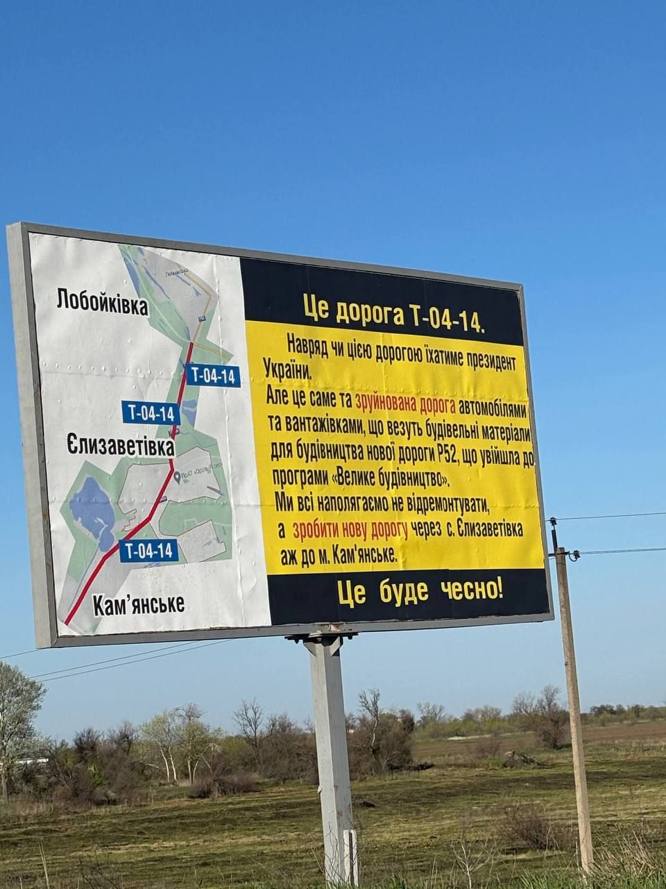 На трасі Т-04-14, що пролягає через Кам’янське та Єлизаветівку, з’явився борд-звернеття від місцевих мешканців. Таким чином люди намагаються достукатися до влади.