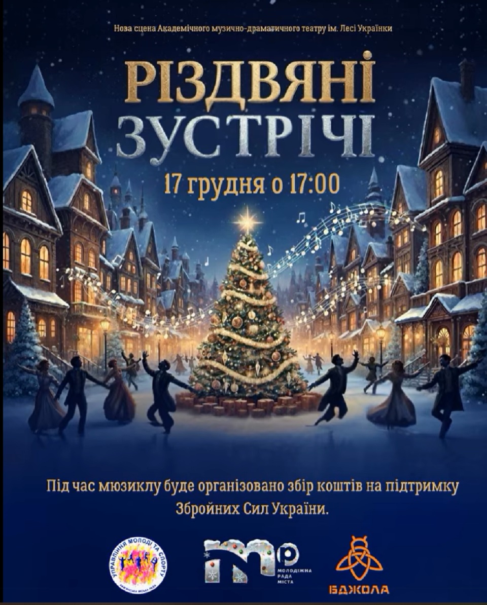 17 грудня о 17:00 Нова сцена театру ім. Лесі Українки перетвориться на місце, де оживають історії, лунають колядки та панує справжній різдвяний настрій. Цей вечір подарує вам атмосферу затишку та святкового тепла. Молодіжна рада КМТГ організовує мюзикл “Різдвяні зустрічі”. Захід відбудеться за підтримки міського голови Андрія Білоусова, ГО «Бджола» і управління молоді та спорту. Гості почують традиційні українські колядки та щедрівки в сучасному аранжуванні, зможуть зарядитись енергією свята від танцювальних колективів та разом з артистами зануритись в магію дуже теплого Різдва. Разом робимо добро: Під час заходу проведуть благодійний аукціон на підтримку ЗСУ. Навіть маленький внесок має велике значення. Тож, ми тут з друзями зібрались вас вітати, веселити, обіймати, зігрівати. ому впускайте в серця й до хати. І вмикайте вже нарешті настрій, настрій колядувати! – звертаються до вас артисти. Запрошення БЕЗКОШТОВНІ! Отримати квиток можна написавши в приватні повідомлення за посиланням у фейсбук: https://www.facebook.com/groups/326110729511687/