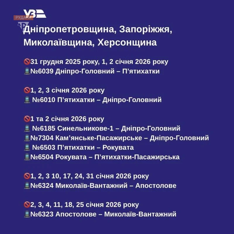 У святкові дні, 31 грудня та в перших числах січня, Укрзалізниця скасовує низку приміських потягів на Дніпропетровщині. В тому числі, й криворізький маршрут до Рокуватої.