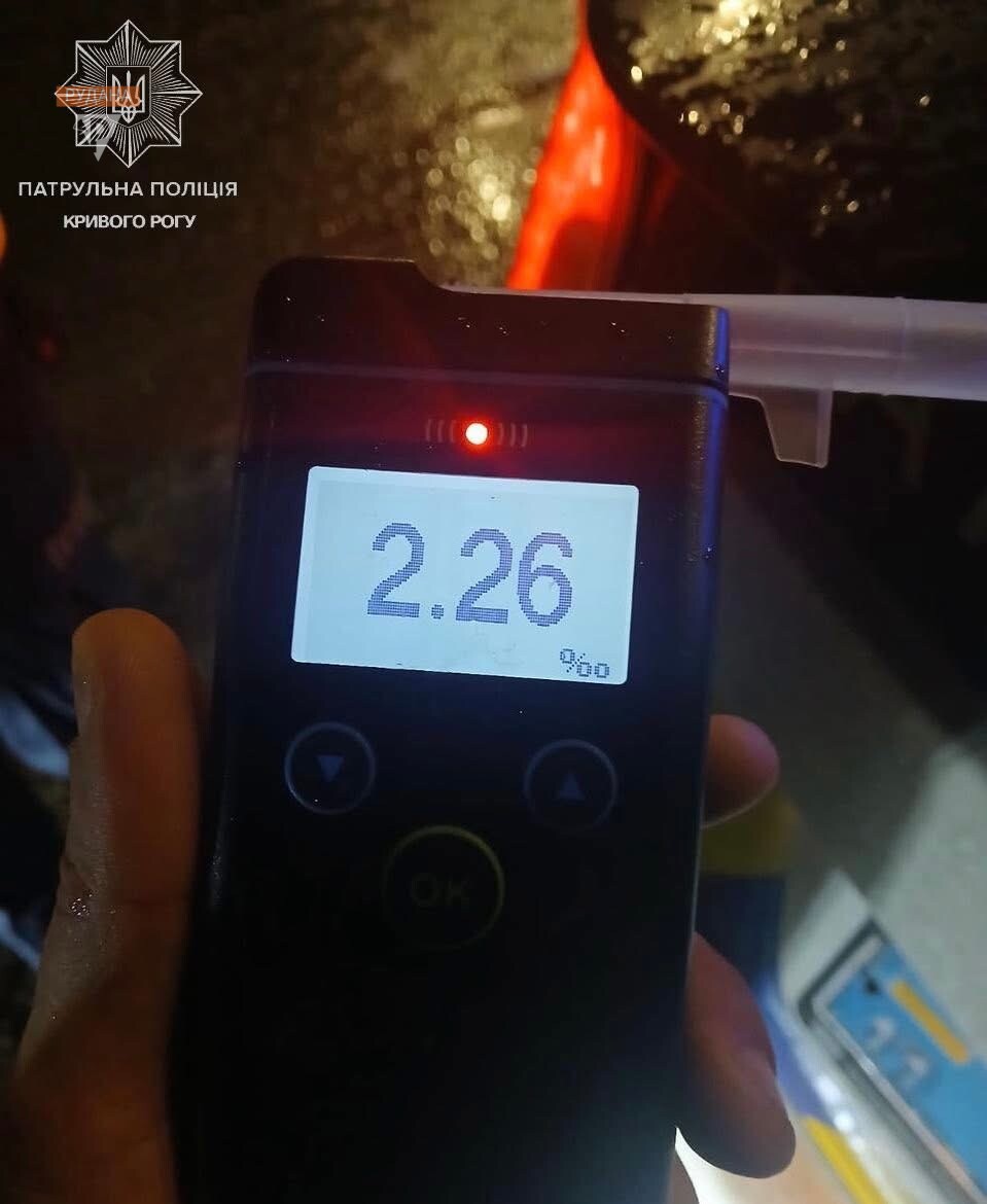 Патрульні зупинили авто. Виявилося, що 32-річний керманич був добряче напідпитку — алкотестер показав 2,26 проміле алкоголю в крові. Це майже у дванадцять разів перевищує допустиму норму.