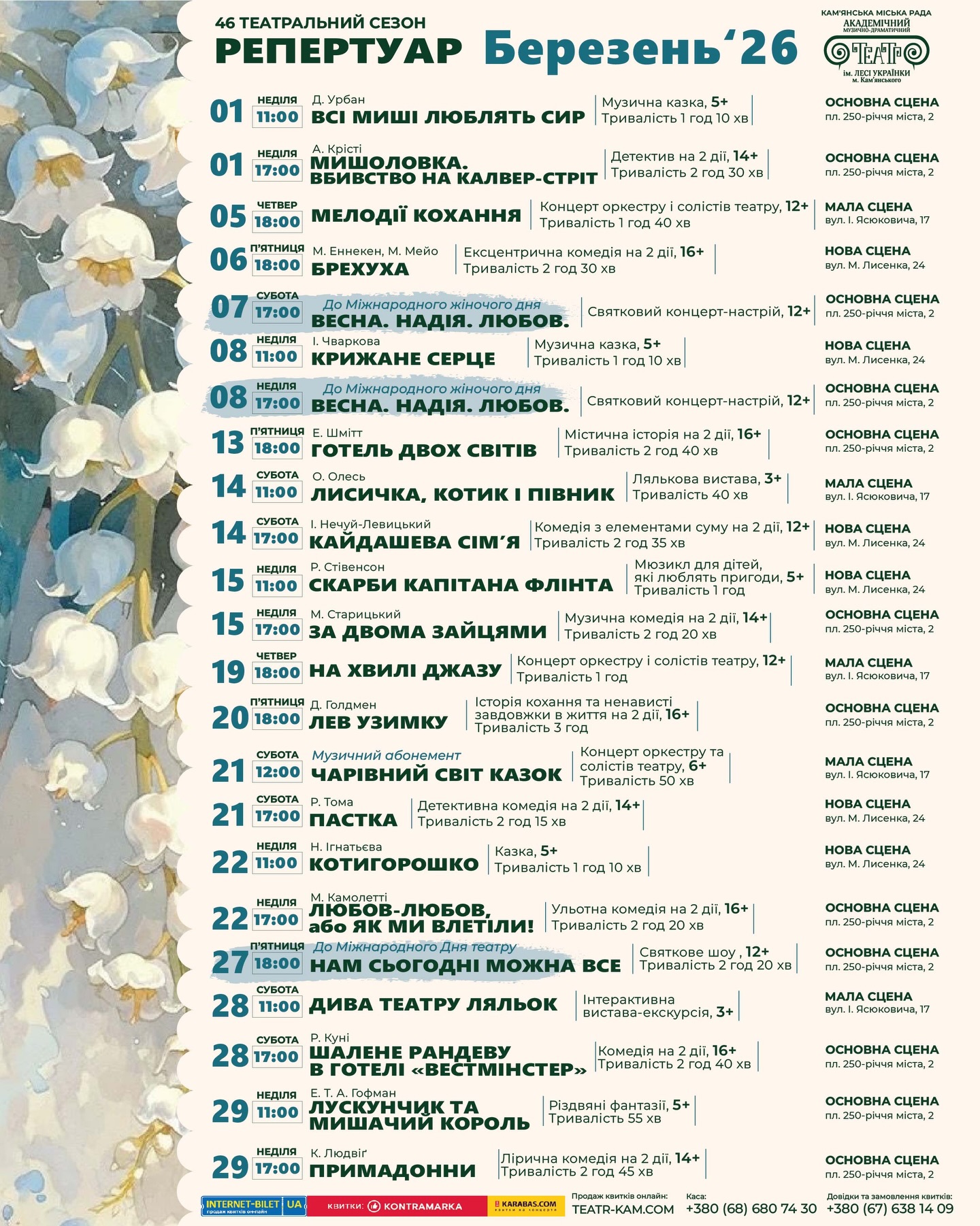 Репертуар на березень Театру ім. Лесі Українки вже чекає на глядачів. Нехай ця весна почнеться з особливої зустрічі — з живими емоціями, світлом сцени та щирими оплесками. Обирайте свою виставу й приходьте за настроєм, натхненням і теплом.