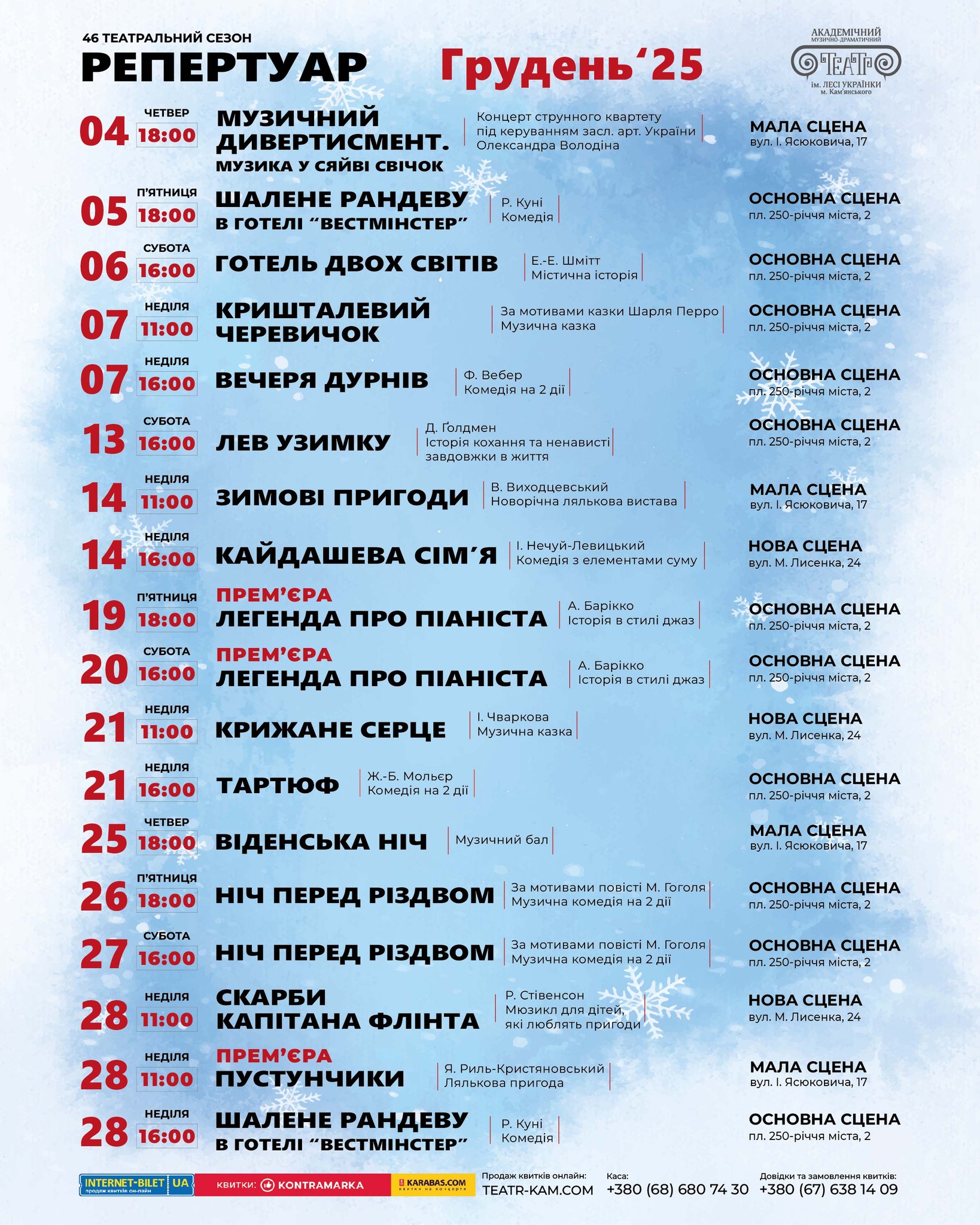 Останній місяць року завжди особливий. Він ніби просить сповільнитися, зібратися разом і пережити щось по-справжньому важливе. Саме тому грудневий репертуар Театру ім. Лесі Українки наповнений подіями, що гріють і надихають. Головна подія місяця — прем’єра! “Легенда про піаніста” — чуттєва, атмосферна й глибока вистава про людину, музику й долю. А для маленьких глядачів — новорічні казки! Свято починається зі сцени: чарівні пригоди, яскраві герої та щасливі фінали, без яких грудень просто неможливий. А ще — улюблені вистави, концерти, зустрічі, що створюють настрій, і моменти, які хочеться забрати з собою у новий рік. Квитки онлайн: https://widget.kontramarka.ua/…/widget38si…/widget/index Каса: (068) 680 74 30 Дитяча кімната: (067) 813 50 50
