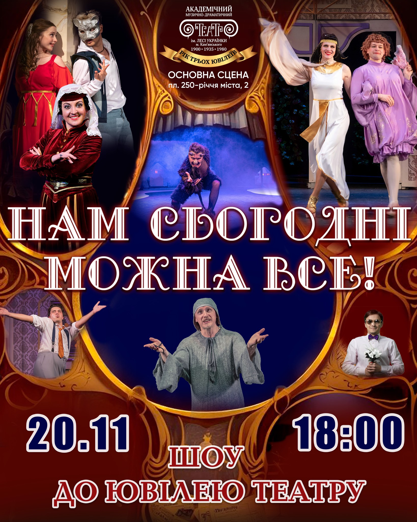 Бувають події, які трапляються раз у житті. Тож Театр ім. Лесі Українки 20 листопада о 18:00 презентує святкове шоу “Нам сьогодні можна все”, присвячене потрійному ювілею театру!   Цього вечора тут будуть згадувати, дякувати, дивувати і, звісно, трошки бешкетувати. Бо коли святкує театр — стримуватись просто неможливо!   Приходьте розділити з акторами цей особливий день. Без глядачів — не буде того самого тепла й магії.   З нагоди ювілею театру – чудові подарунки для глядачів! Також у листопаді ви маєте унікальну нагоду подивитися улюблені вистави за святковою зниженою ціною! – 50 грн на кожен квиток на вистави: «Англійська рулетка», «За двома зайцями», «Сватання на Гончарівці», «Летюча миша», «Гра у кохання», «Примадонни», «Обережно, жінки» та концерт «Магія звуків».   Для маленьких глядачів: казки «Троє поросят», «Тигренятко, що казало «р» та «Золоте курча»   А ще – «Украдене щастя» за єдиною ціною 150 грн (вільна посадка).   В такий спосіб актори вирішили подякувати глядачам за любов до театру і за всі емоції, які проживають разом уже стільки років.