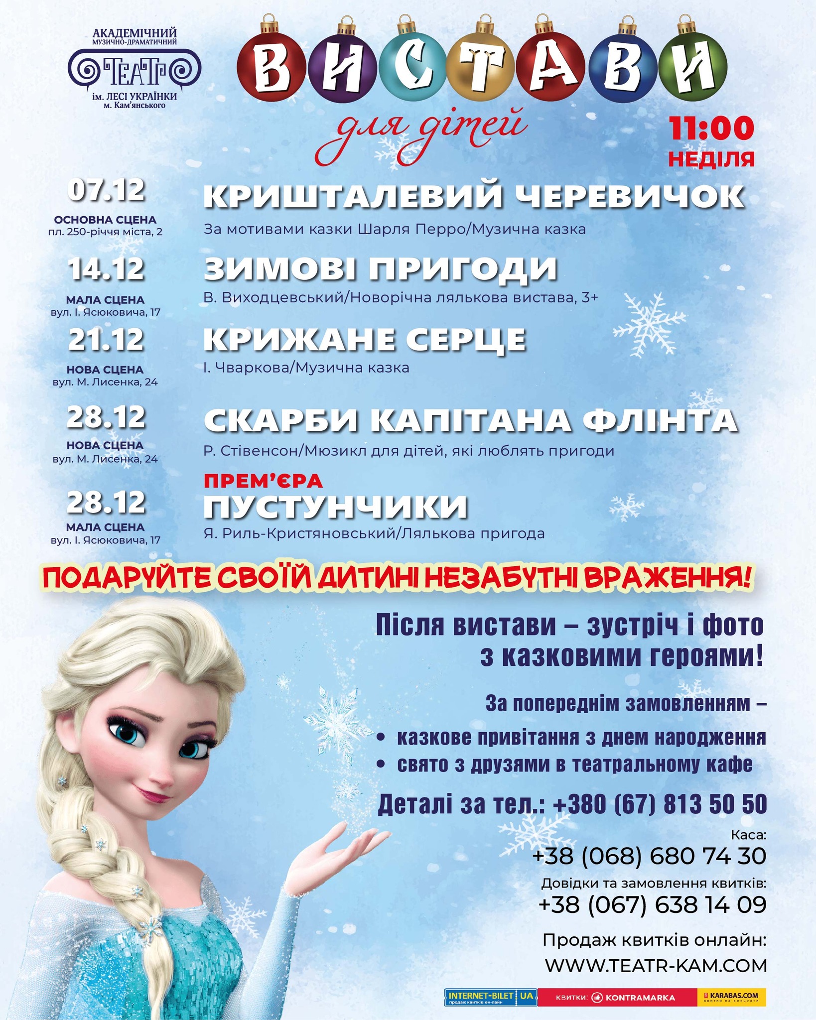 У грудні в Театрі ім. Лесі Українки починається найчарівніша пора — сезон новорічних казок. Той момент, коли сцена перетворюється на світ чарів, а діти затамовують подих, бо вірять у диво так щиро, як тільки вміють. Попереду — яскраві історії, теплі емоції, сміх, музика й зустрічі з улюбленими героями. Актори вже готують все, щоб кожна дитина відчула себе частиною маленького дива, а батьки хоч на мить переключилися від щоденних турбот. Квитки: https://widget.kontramarka.ua/…/widget38si…/widget/index Каса: (068) 680 74 30 Дитяча кімната: (067) 813 50 50