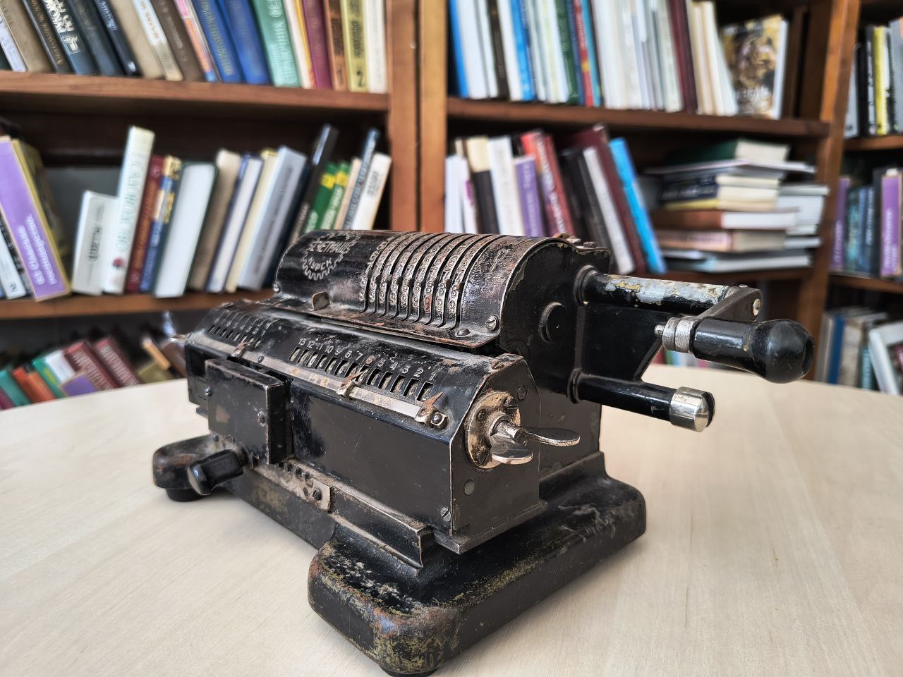 У музейній кімнаті Бібліотеки ім. Т. Шевченка з’явився новий експонат — арифмометр, механічний попередник сучасного калькулятора. Цей дивовижний пристрій уміє додавати, віднімати, множити й ділити за допомогою ручки та системи шестерень. Його активно використовували в банках, державних установах та інженерних розрахунках — арифмометр значно пришвидшував роботу з числами й став першим у світі обчислювальним пристроєм, який почали масово виробляти. Усередині — складний механізм зубчастих коліс, справжній «механічний мозок», що працює без жодної електрики. Перший успішний арифмометр створив француз Шарль Ксав’є Томас у 1820 році — і саме з нього розпочалася історія обчислювальної техніки.