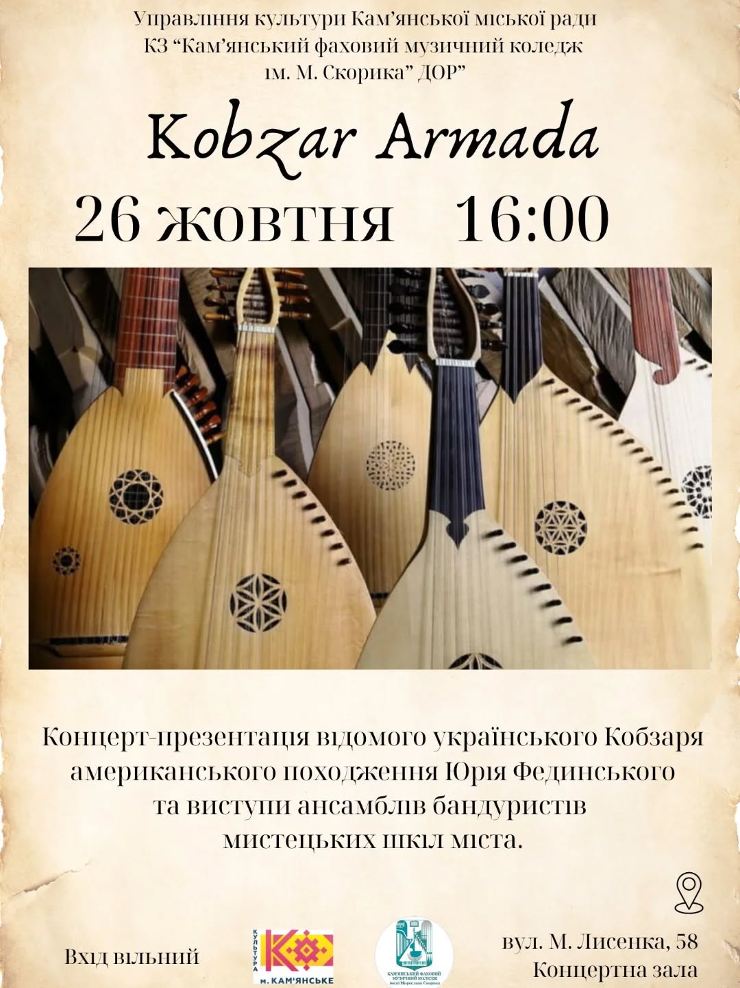 26 жовтня о 16:00 на базі Камʼянського фахового музичного коледжу імені Мирослава Скорика відбудеться концерт-презентація Юрія Фединського — відомого українського кобзаря, композитора, дослідника та майстра народних інструментів з американським корінням! Юрій Фединський — особлива постать в українській культурі. Народжений у США, він обрав шлях служіння українській традиції, переїхавши в Україну, щоб відроджувати древнє мистецтво кобзарства. Його творчість — це міст між минулим і сучасністю, між Сходом і Заходом, між голосом предків і викликами сьогодення. У програмі концерту — живе виконання на автентичних інструментах: кобзі, бандурі та торбані, які Юрій Фединський власноруч створює за зразками давніх майстрів, відроджуючи забуте мистецтво і неповторне звучання епохи. У заході також візьмуть участь бандурні колективи міста, які представлять сучасне обличчя української бандури, демонструючи її яскраве й актуальне звучання. Подія стане майданчиком для творчого діалогу та обміну досвідом між виконавцями, поколіннями і традиційними школами гри, відкриваючи нові грані української музичної спадщини. Місце проведення: Камʼянський фаховий музичний коледж ім. М. Скорика. Дата і час: 26 жовтня 2025 року, початок о 16:00. Вхід вільний.