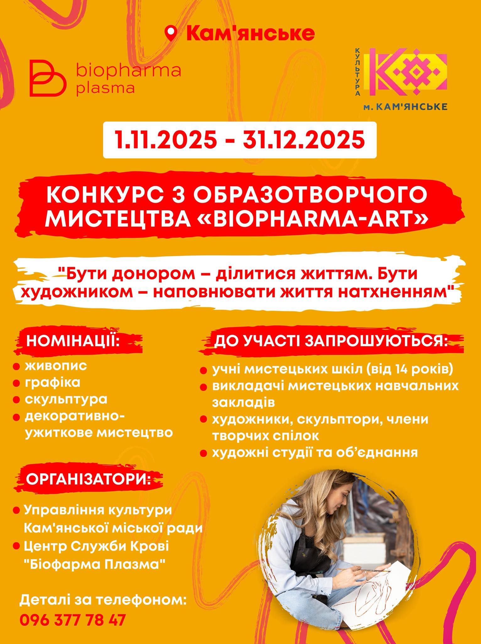 ТОВ ЦСК «Біофарма плазма» та департамент культури Камянського оголошують конкурс з образотворчого мистецтва «Biopharma-ART». 1. Загальні положення 1.1. Конкурс з образотворчого мистецтва «Biopharma-ART» (далі – Конкурс) проводиться з метою популяризації ідеї донорства через мистецтво, формування гуманістичних цінностей, розвитку творчості серед молоді та професійних митців.   1.2. Головне гасло Конкурсу: «Бути донором – ділитися життям. Бути художником – наповнювати життя натхненням».   1.3. Організатором Конкурсу є управління культури міської ради, ТОВ ЦСК «Біофарма плазма».   1.4. Конкурс проводиться на территорії Кам’янської міської територіальної громади.   2. Мета та завдання Конкурсу • популяризація донорського руху через мистецькі засоби; • формування позитивного іміджу донора як символу доброти, співчуття й відповідальності; • підтримка талановитих митців та учнів мистецьких шкіл; • розвиток креативного мислення, виховання гуманістичних ідей через мистецтво; • об’єднання художників і творчих спільнот навколо соціально важливої теми. 3. Учасники Конкурсу 3.1. До участі запрошуються:   • учні мистецьких шкіл (від 14 років); • викладачі мистецьких навчальних закладів; • художники, скульптори, члени творчих спілок; • художні студії та об’єднання. 3.2. Участь у Конкурсі є безкоштовною.   4. Номінації Конкурсу • Живопис • Графіка • Скульптура • Декоративно-ужиткове мистецтво 5. Умови участі 5.1. Учасники подають одну роботу (за вибором) у будь-якій з номінацій.   5.2. Твори повинні відповідати тематиці Конкурсу: донорство, життя, добро, взаємопідтримка, людяність, натхнення, відновлення та бути   5.3. До кожної роботи подається заявка (додаток до Положення), яка містить:   • прізвище, ім’я, по батькові автора; • вік; • навчальний заклад / організацію / статус (учень, викладач, художник тощо); • контактний телефон та e-mail; • назву та короткий опис роботи. 5.4. Роботи подаються у встановлений термін — з 01.11.2025 до 31.12.2025 до Кам`янської художньої школи імені Роберта Лісовського за адресою: вул. Валентина Бурхана, 9, ПН-ПТ з 13.00 до 16.00.   6. Критерії оцінювання • відповідність тематиці; • художня майстерність і композиційна цілісність; • оригінальність задуму; • емоційна виразність; • креативність подачі ідеї донорства. 7. Визначення переможців та нагородження 7.1. Роботи оцінює професійне журі, до складу якого входять представники організаторів, відомі митці, мистецтвознавці.   7.2. За підсумками Конкурсу визначаються переможці у кожній номінації.   7.3. Переможці та лауреати отримують дипломи, цінні подарунки та можливість експонування своїх робіт на підсумковій виставці «Biofarma-ART». За рішенням професійного журі та організаторів може буди визначена грошова винагорода для окремих учасників.   7.4. Найкращі роботи можуть бути використані у соціальних кампаніях, виставках або благодійних заходах, присвячених донорству (з дозволу автора).   8. Підсумкова виставка 8.1. Після завершення Конкурсу організовується підсумкова виставка, де будуть представлені найкращі твори учасників та відбудеться нагородження переможців.   8.2. Виставка може бути проведена у культурних закладах, галереях або онлайн-форматі.   9. Контактна інформація: за телефоном 096 377 78 47 Додаток 1 ЗАЯВКА УЧАСНИКА 1. Прізвище, ім’я, по батькові __________________________________________ 2. Дата народження __________________________________________ 3.