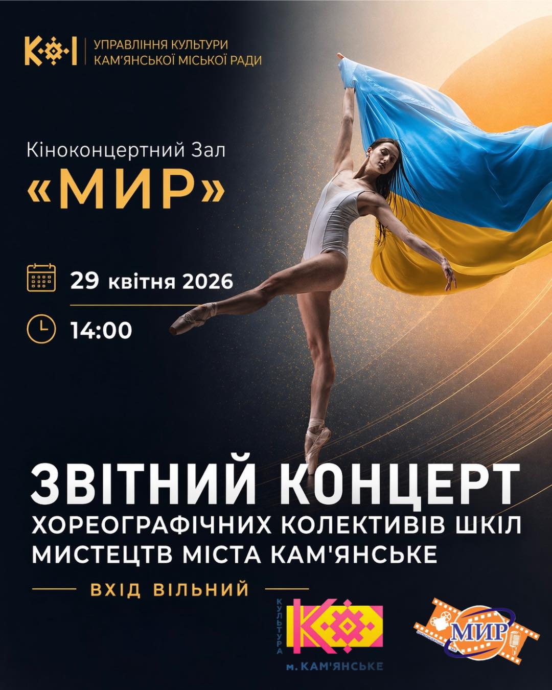 Запрошуємо на звітний концерт хореографічних колективів шкіл мистецтв міста Кам’янське! Це буде яскравий підсумок творчого року, наповнений енергією танцю, емоціями та талантом наших дітей. 29 квітня 14:00 Кіноконцертний зал «Мир» Вхід вільний Приходьте підтримати юних артистів і насолодитися справжнім святом хореографії.
