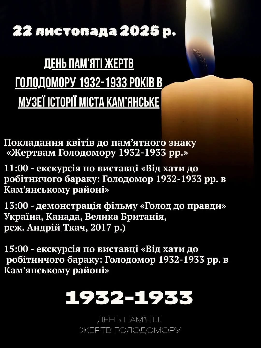 Музей історії міста Кам’янське запрошує долучитися до заходів, присвячених Дню пам’яті жертв Голодомору 1932-1933 років.   Цього дня ми вшановуємо мільйони невинних жертв, убитих тоталітарним режимом. Прийдіть, щоб пам’ятати та засвідчити істину.   Програма заходів у Музеї історії міста Кам’янське:   11:00 — Екскурсія по виставці «Від хати до робітничого бараку: Голодомор 1932-1933 рр. в Кам’янському районі».   13:00 — Демонстрація фільму «Голод до правди» (Україна, Канада, Велика Британія, реж. Андрій Ткач, 2017 р.).   15:00 — Повторна екскурсія по виставці «Від хати до робітничого бараку: Голодомор 1932-1933 рр. в Кам’янському районі».   Протягом дня також відбудеться покладання квітів до пам’ятного знаку «Жертвам Голодомору 1932-1933 рр.».   Дата: 22 листопада 2025 р. Місце: Музей історії міста Кам’янське   Пам’ятаймо! Пам’ять — це зброя.   За повідомленням Музею історії Кам’янського.