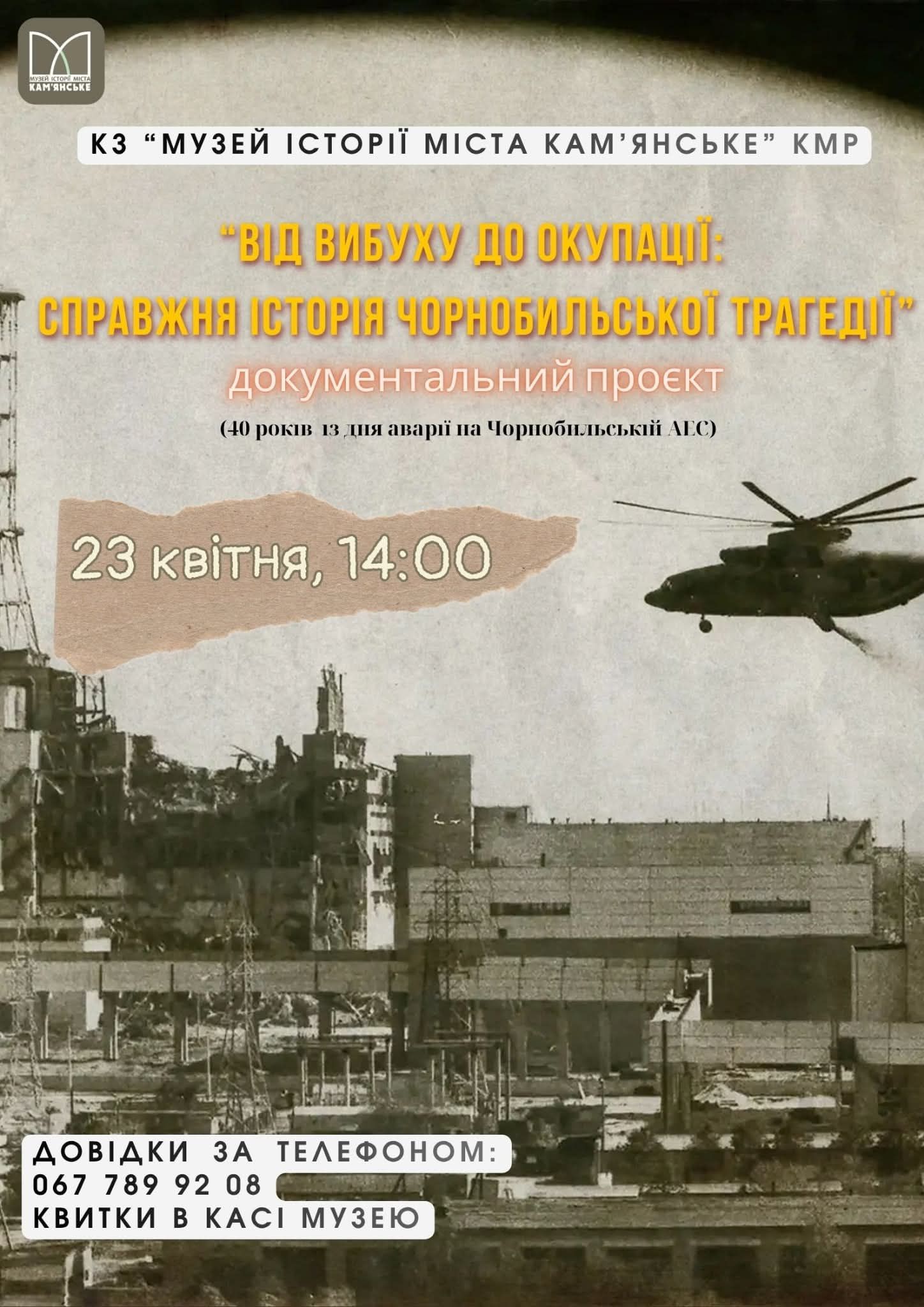 Музей історії міста Кам’янське запрошує на перегляд документального фільму «Від вибуху до окупації: Справжня історія Чорнобильської трагедії» Чорнобильська катастрофа — це рана, яка не гоїться. Це історія про невидимого ворога, про мужність ліквідаторів, які врятували мільйони, та про злочинне мовчання Москви, що намагалася приховати правду. Сьогодні ця тема набуває нового, ще більш тривожного звучання. У 2022 році Чорнобильська зона знову опинилася в заручниках — цього разу під окупацією російських загарбників, які перетворили місце світової трагедії на інструмент ядерного тероризму. Коли: 23 квітня о 14:00 Де: Музей історії міста Кам’янське Квитки: у касі музею Довідки за телефоном: 067 789 92 08 Приходьте, щоб згадати, усвідомити та не дати правді зникнути.