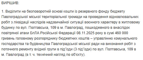 Згідно з проєктом рішення Павлоградської міської ради з міського бюджету планується виділити 460 тис. грн на відновлення трьох під’їздів житлового будинку по вул. Полтавській 109. Будинок, як сказано постраждав внаслідок атаки безпілотників 8 листопада 2025 року.