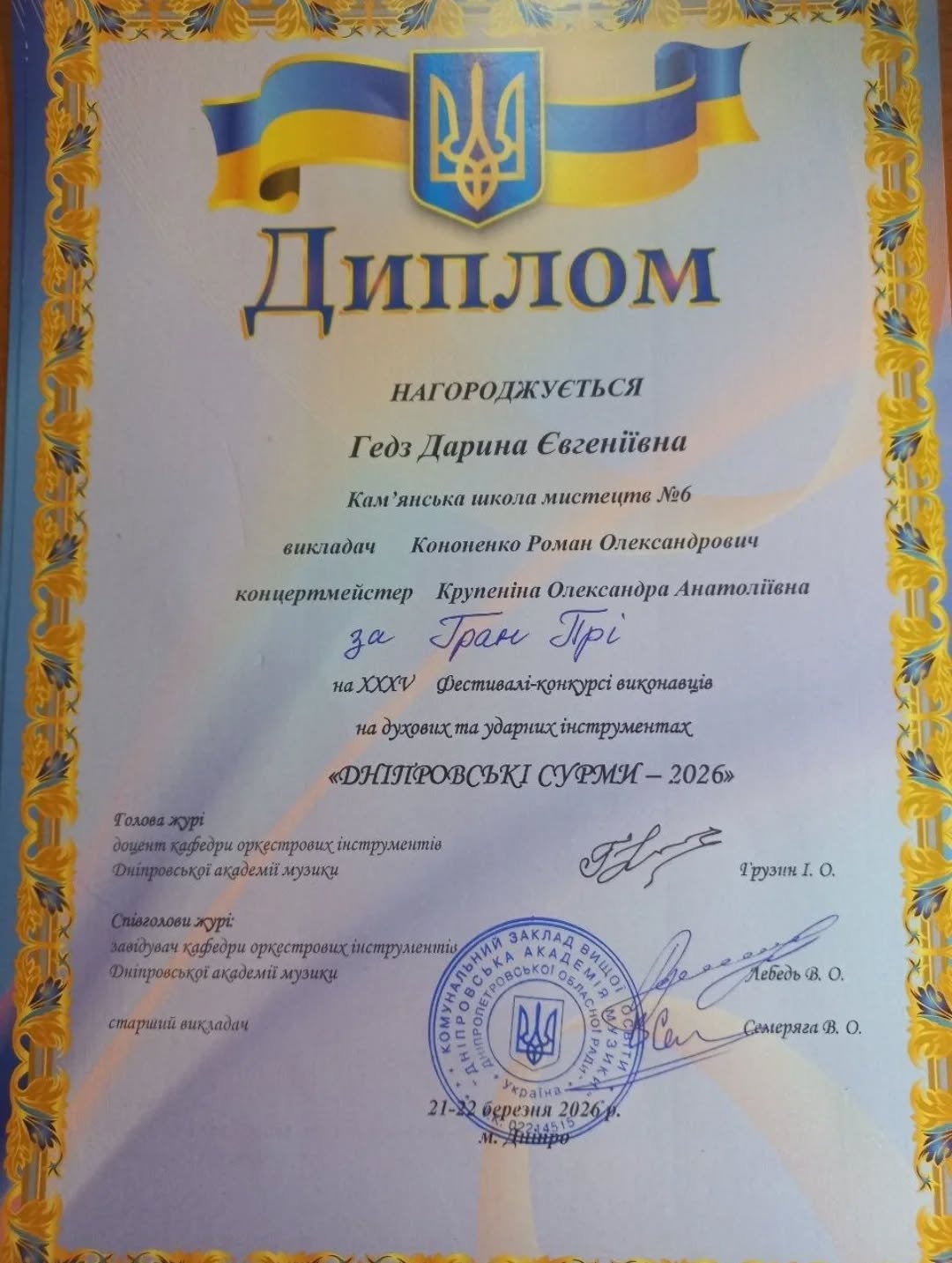 Справжнім святом музики та професійної майстерності став ХХХV Обласний фестиваль-конкурс “Дніпровські сурми-2026”, який проходив 21–22 березня у стінах Дніпровської академії музики. Для учнів Кам’янської школи мистецтв №6 ця подія завершилася грандіозним успіхом та визнанням на високому рівні.