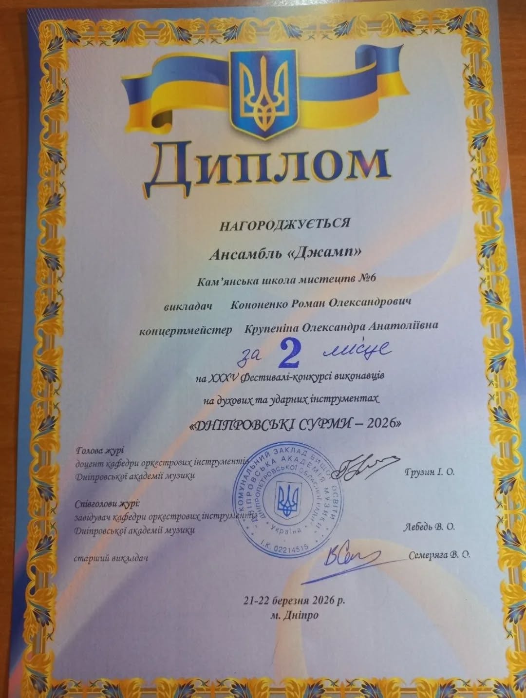 Ансамбль духових інструментів “Jump” — диплом ІІ ступеня. Колектив подарував слухачам впевнену, технічну та надзвичайно емоційну гру, яка стала яскравою та незабутньою окрасою всієї конкурсної програми.