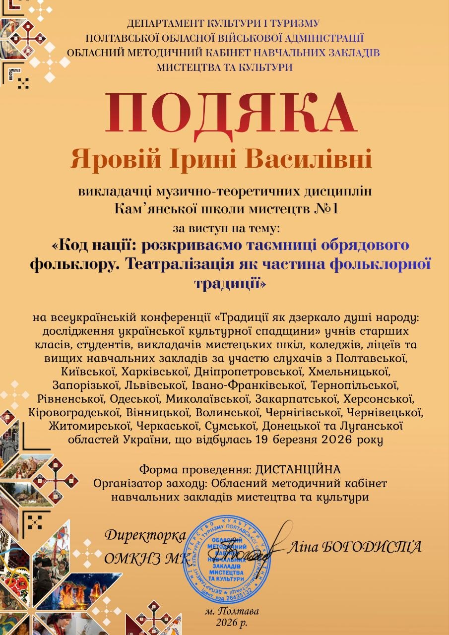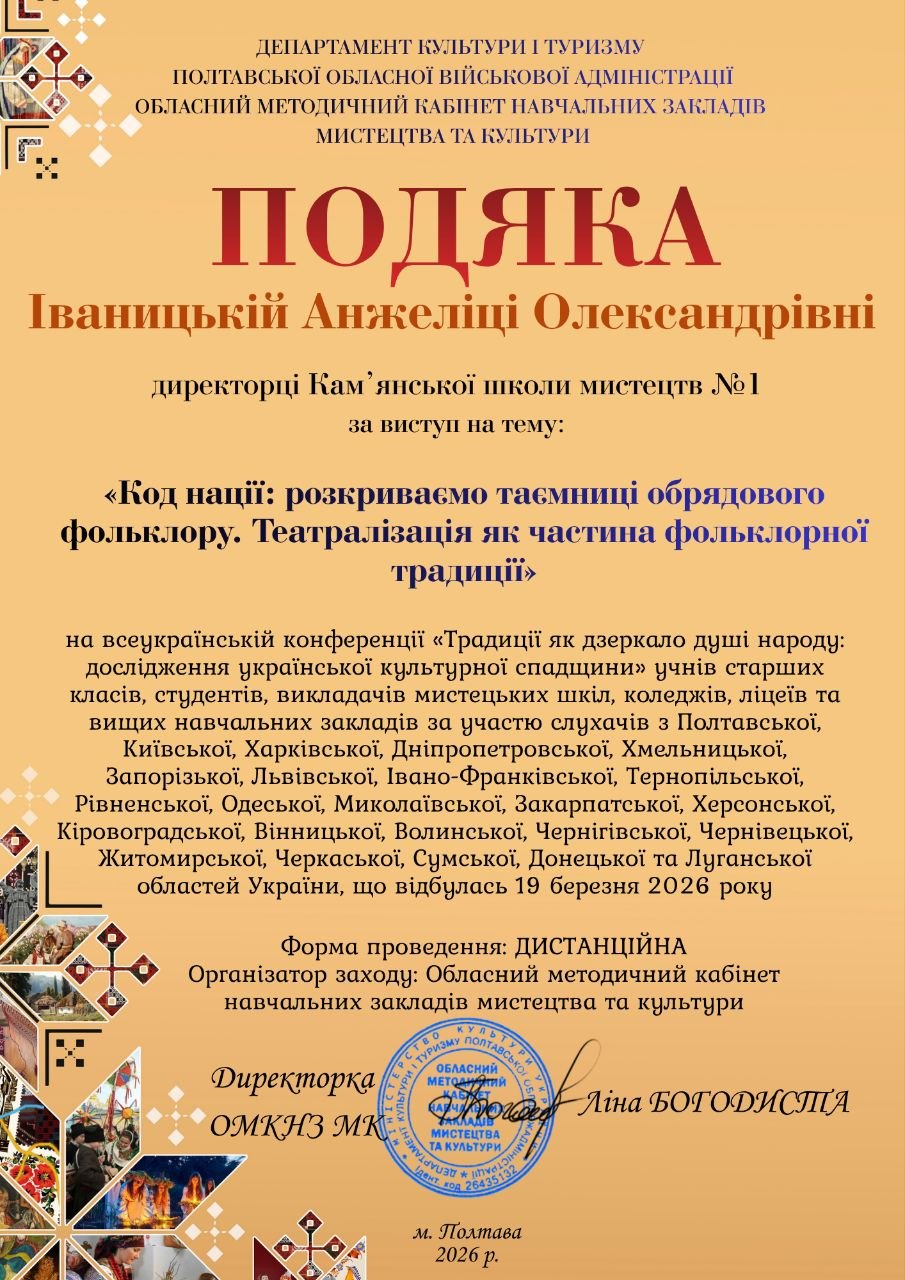 19 березня  викладачі Кам’янської школи мистецтв №1  стали активними учасниками Всеукраїнської конференції “Традиції як дзеркало душі народу”. Цей масштабний форум став майданчиком для професійного єднання представників культурних та освітніх установ з усіх куточків нашої країни.