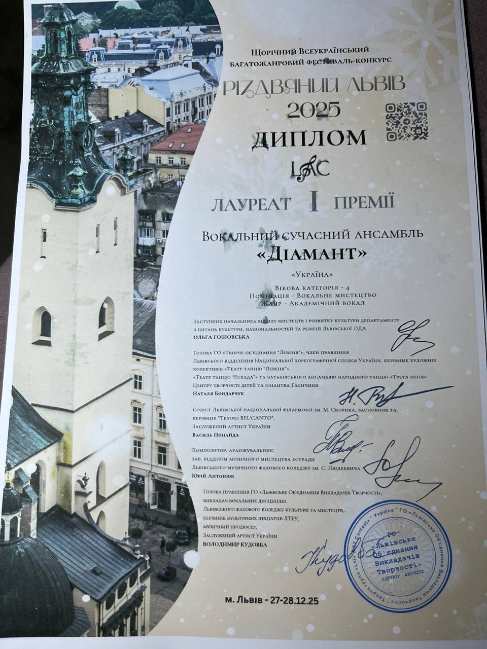Грандіозний успіх ансамблю: Вокальний колектив “Діамант” став лауреатом І премії. До складу ансамблю-переможця увійшли: Ірина Юрченко, Анастасія Задорожня, Ліка Балта, Кіра Білоус, Вікторія Овчаренко, Богдана Фандій та Марія Малюк (концертмейстер — Софія Мамедова).
