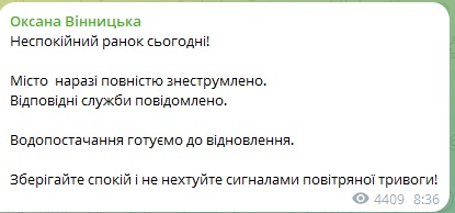 Пошкоджено інфраструктуринй об’єкт. Місто залишилось без світла та води.