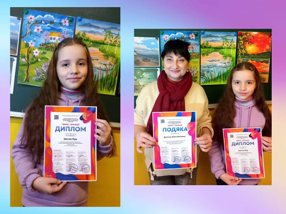 Учениця відділення образотворчого мистецтва Кам’янської школи мистецтв №2 Шестак Кіра (клас викладача Ірини Дзінгель) взяла участь у номінації “Декоративно-прикладне та образотворче мистецтво”.