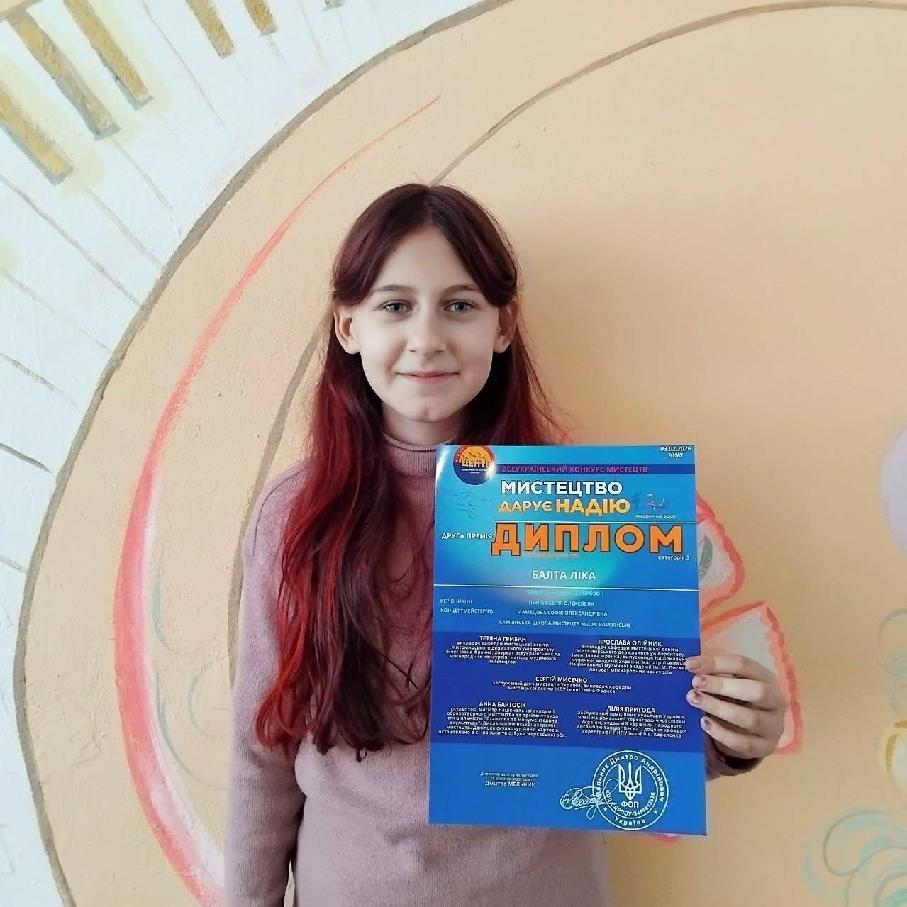 3 лютого 2026 року відбувся масштабний Всеукраїнський конкурс мистецтв “Мистецтво дарує надію”, який об’єднав обдарованих виконавців з усієї країни. Серед учасників гідно представила свою майстерність і Ліка Балта— учениця 2-го класу базового підрівня Кам’янської школи мистецтв №2.