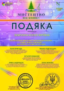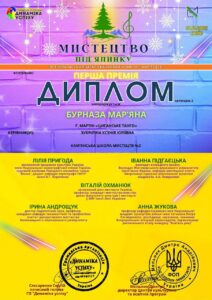 Напередодні новорічних свят вихованка фортепіанного відділу Мар’яна Бурназа здобула перемогу на Всеукраїнському багатожанровому дистанційному конкурсі “Мистецтво під ялинку” (м. Київ). За майстерне виконання композиції Г. Мартіна “Циганське танго” юна піаністка була відзначена дипломом лауреата І ступеня.