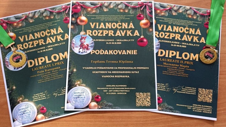Участь вихованців Кам’янської школи мистецтв №4 у Міжнародному онлайн-конкурсі талантів “Vianočná rozprávka” перетворилася на справжню різдвяну історію успіху. Творчі змагання проходили з 24 по 30 грудня 2025 року в межах культурного співробітництва між Словаччиною та Україною за сприяння WAF – Art World Festivals (м. Кошице).