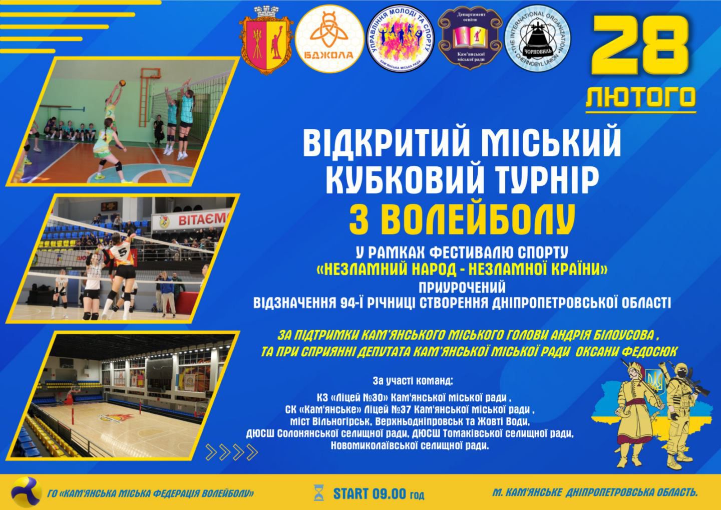 28 лютого у Кам’янському відбудеться Відкритий міський кубковий турнір з волейболу. Спортивний захід пройде в рамках фестивалю спорту “Незламний народ – незламної країни” та приурочений до відзначення 94-ї річниці створення Дніпропетровської області.